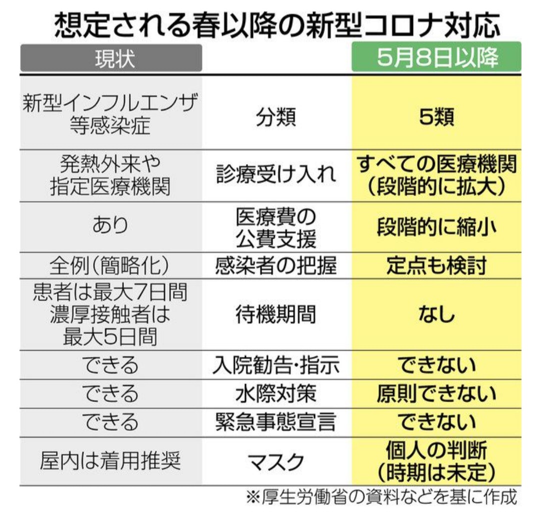 新型コロナウイルスの位置づけについて令和5年5月8日から5類感染症になります。これは新型インフルエンザ等感染症にも該当せず、これまで行ってきた対策、措置について見直しが行われることでしょう!