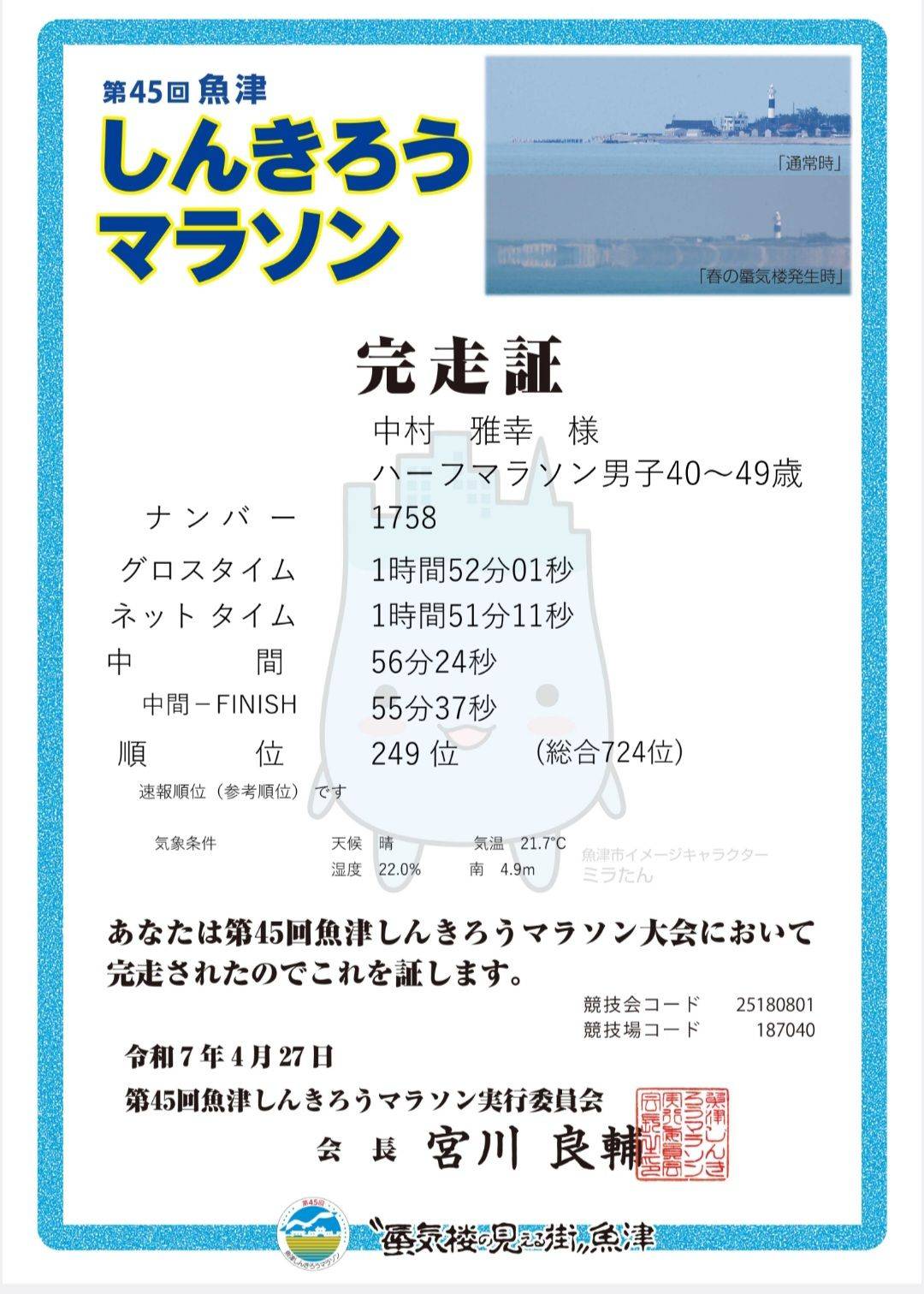 中村 ハーフマラソン 1時間51分15秒