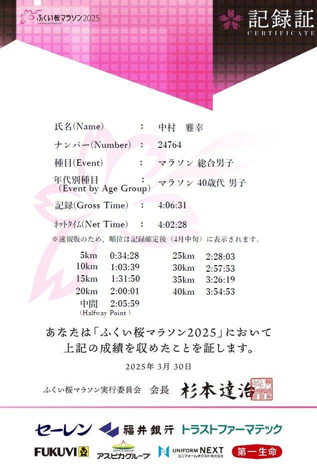 中村 フルマラソン 4時間2分28秒(PB)